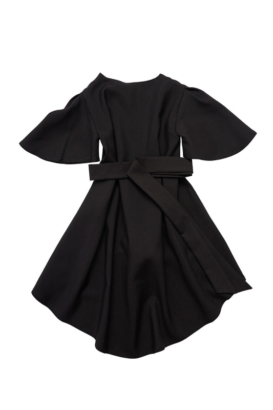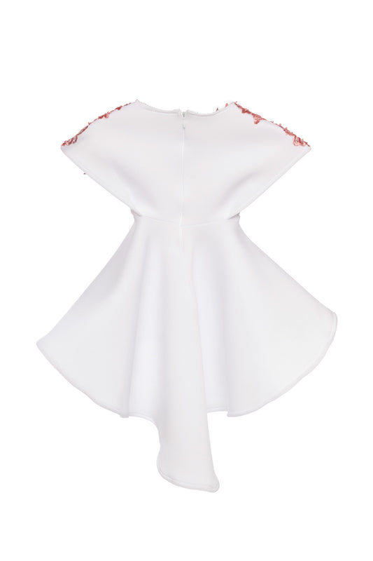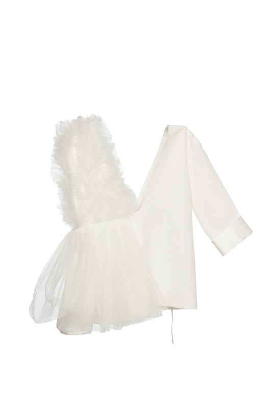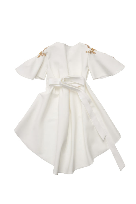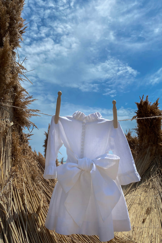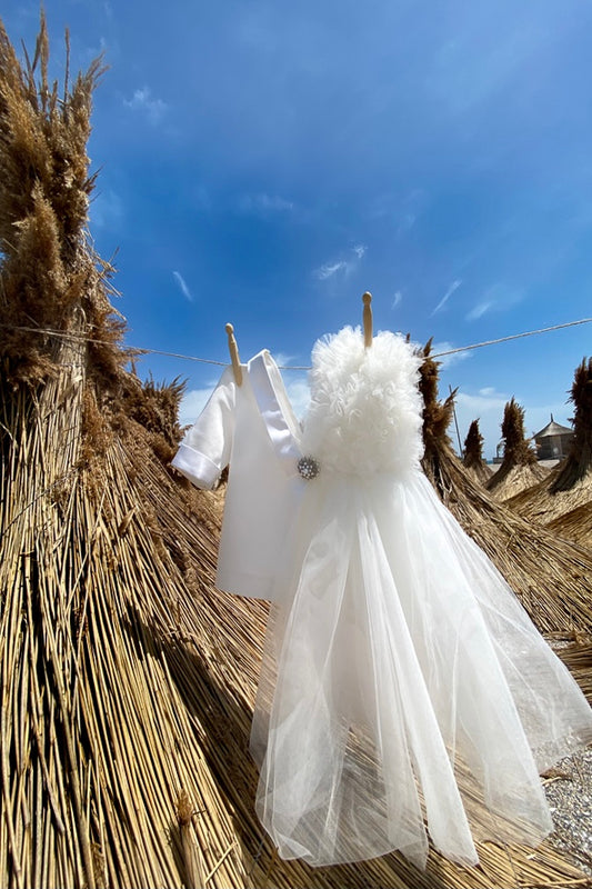 Rochie copii alba lunga tip sacou cu volanase si brosa